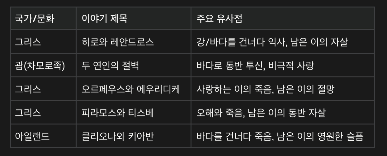 이와 유사한 주제(강·바다를 건너다 죽음, 비극적 사랑, 남은 이의 절망과 죽음)를 가진 세계 각국의 대표적인 설화를 정리하면 다음과 같습니다.