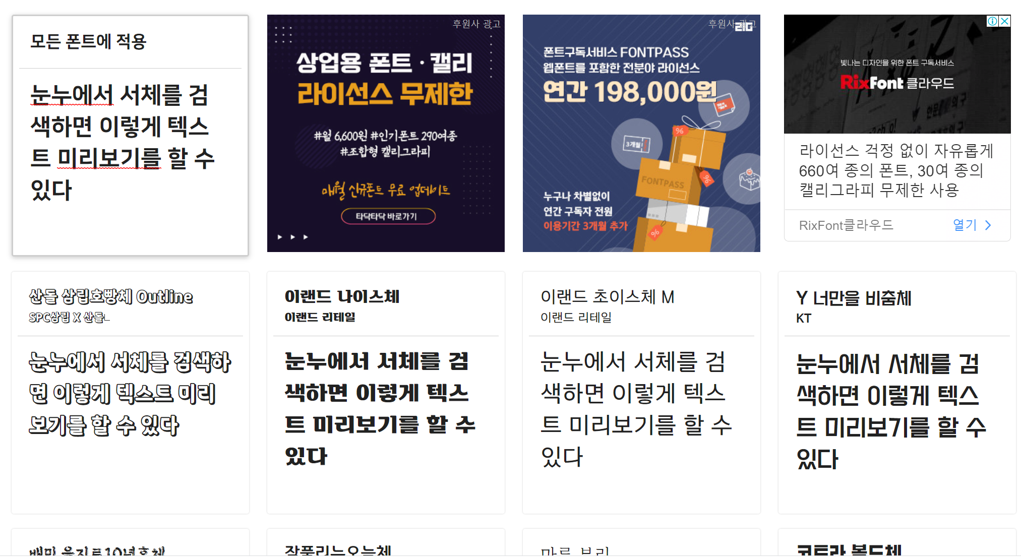 그럴 때 눈누에서 폰트별 텍스트를 쳐보고 적합하다 싶으면 설치하는 게 상책이다.