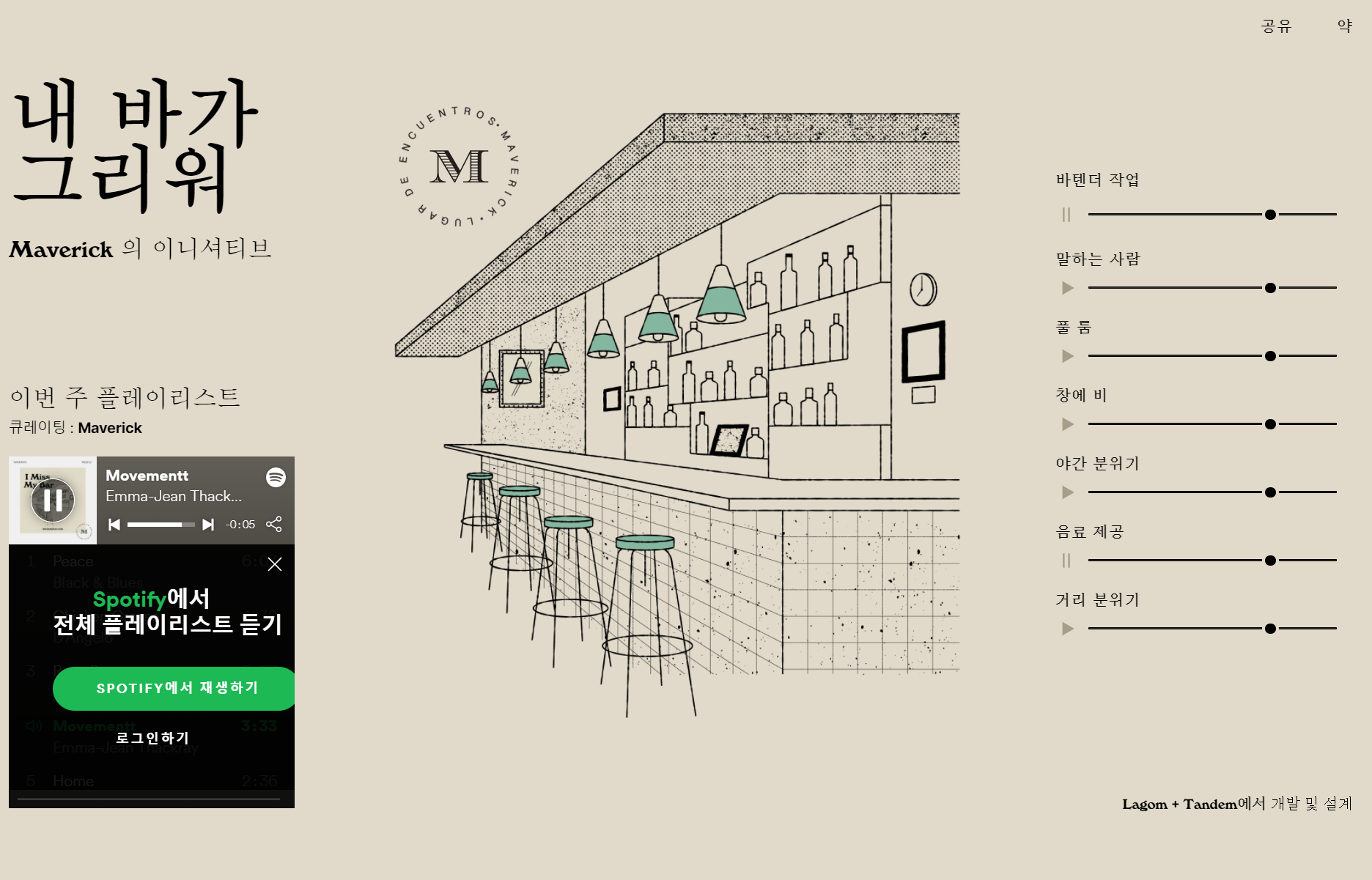 여기 너무 재밌다. 바에 앉아 있는 것처럼 음악이 흘러나오고, 음악 뿐만 아니라 바텐더, 말소리, 빗소리 등을 곁들여서 ASMR까지 자극해주는~