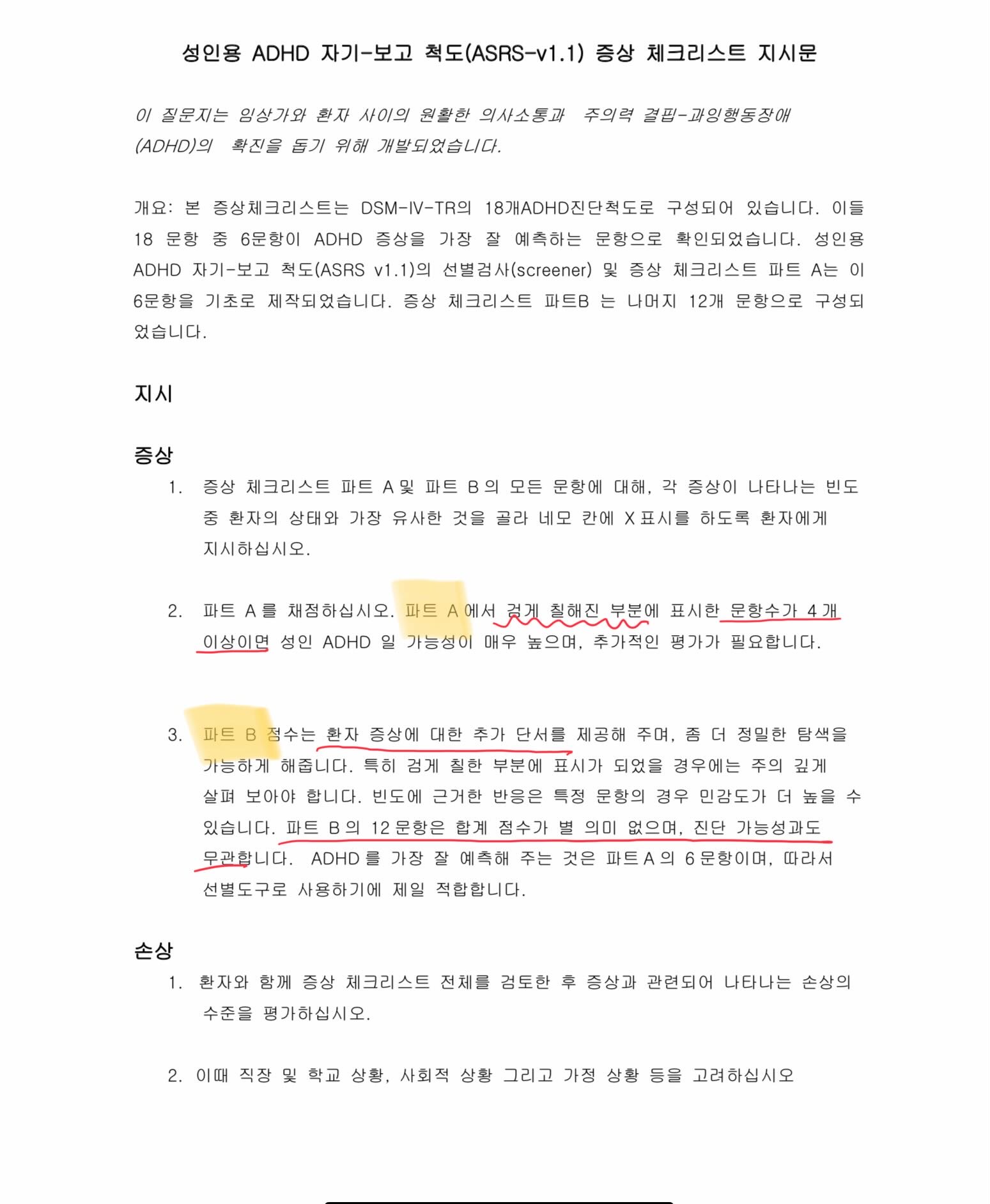 인터넷에서 ADHD 자가보고 척도 증상 체크리스트를 아주 손쉽게 구할 수 있었다.