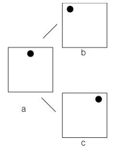 a처럼 점을 상부의 중앙에 두면 비중이 위에 놓여지면서 낙하의 역학성이 강해지고 불안정 b, c와 같이 좌상 또는 우상으로 이동하면 불안정성이 더욱 강해진다.